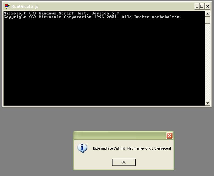 die neue xp-iso wurde auch ohne programme installiert, und es kam auch kein fenster etc. ich stelle dir mal einige infos bereit: - ordnerstruktur - bsp. Bild - settings.txt - RunOnceEx.js - winnt.sif (ohne key übrigens passiert folgendes: wenn ich die datei RunOnceEx.js manuell starte, dann kommen in abstand von ca. 10 sek. zwei fenster--> wenn ich dann auf ok drücke, skipt er wohl und versucht die nächste software. ich habe das gefühl, es handelt sich wirklich nur um ein kleines problem, mir fehlt halt das auge dafür. vielen dank vitali f